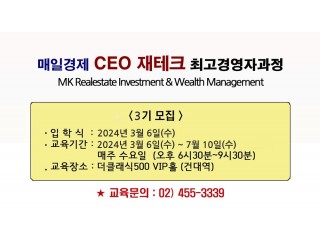 ★ 매일경제 CEO 재테크 최고경영자과정 제 3 기 모집 ★ ▣ 모집인원 : 50명 ▣ 교육기간 : 2024년 3월 6일(수) ~ 7월 10일(수) ▣ 교육시간 : 매주 수 …