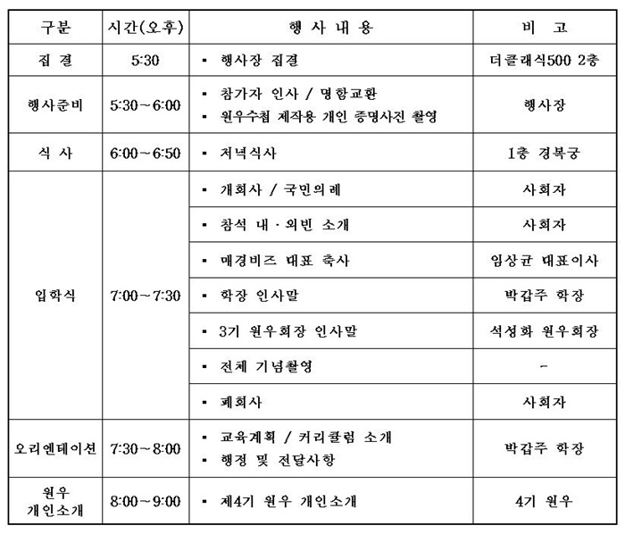 매일경제 CEO 재테크 최고경영자과정 4기 입학식 행사계획